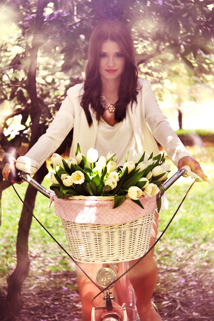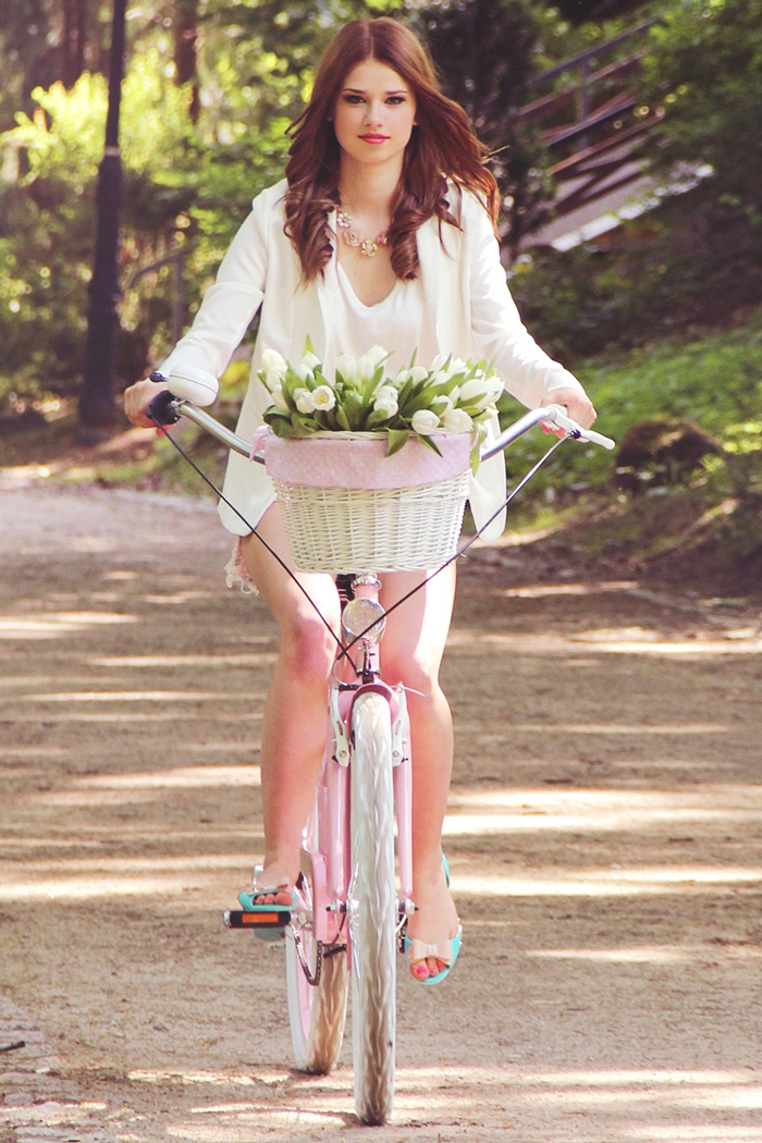 Jakiś czas temu spełniłam jedno ze swoich małych marzeń i kupiłam wyjątkowy rower. Od razu w mojej głowie zrodził się pomysł wykonania zdjęć w lekko bajkowym klimacie. W południe wraz z Gosią wybrałyśmy się do parku na zdjęcia. Mam nadzieję, ze nasza współpraca przypadła wam do gustu :) Nawet ja - wielki leń, zebrałam się w sobie, wstałam o siódmej rano i pojechałam do hurtowni kwiatów po ten przepiękny bukiet białych tulipanów.